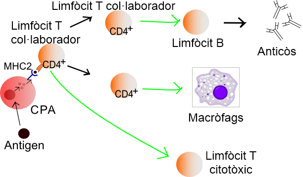 Активация пути Т-лимфоцитов срабатывает, когда Т-клетки встречают его антиген, соединенный с молекулой МНС, на поверхности инфицированной клетки или фагоцитов. Т-клетки способствуют иммунной защите по двум основным направлениям: некоторые направляют и регулируют иммунный ответ, другие непосредственно акакуют зараженные или раковые клетки.